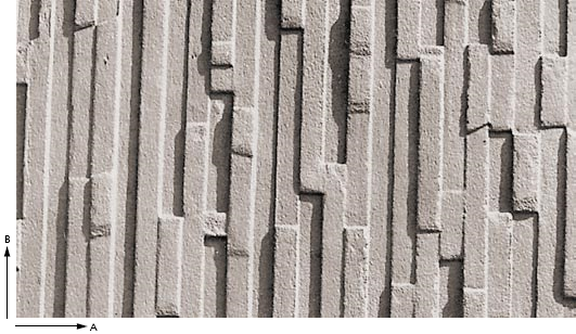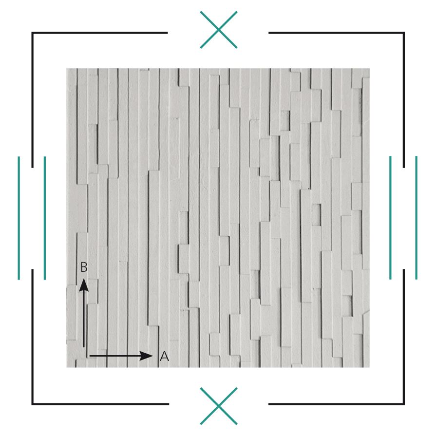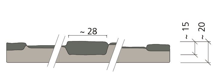 Trójwymiarowa, "wolna" struktura do układania poziomo lub pionowo. Relief tworzą drewniane listwy o szerokości 28 mm w różnych grubościach i długościach; piaskowana warstwa nadaje powierzchni przyjemną chropowatość.