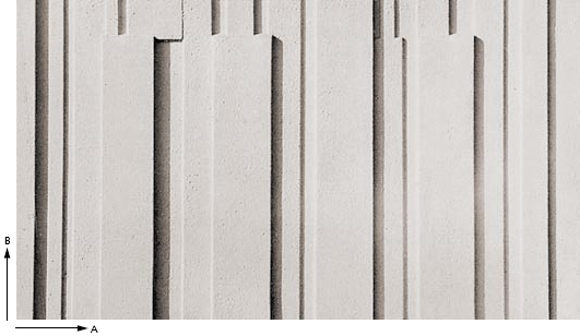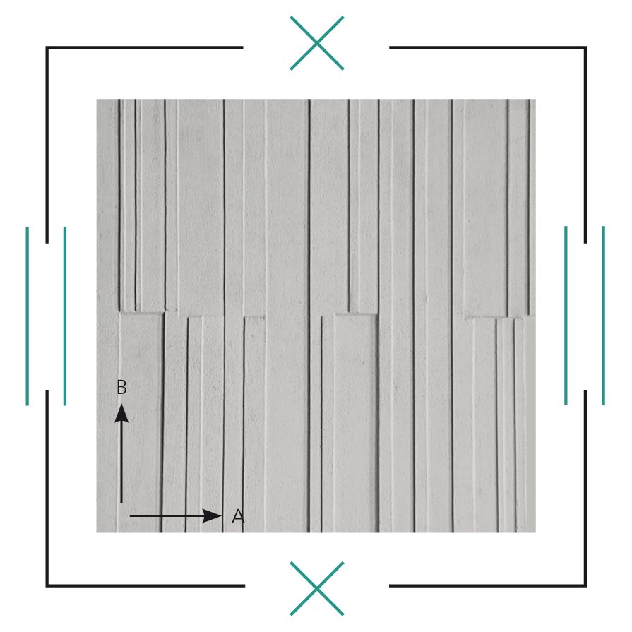 Nieregularnie długie, wysokie i grube heblowane listwy drewniane dają mocny efekt 3D. Dodatkowe piaskowanie podkreśla chropowatość; matrycę można stosować poziomo i pionowo, uzyskując wyraźną grę światła i cienia.
