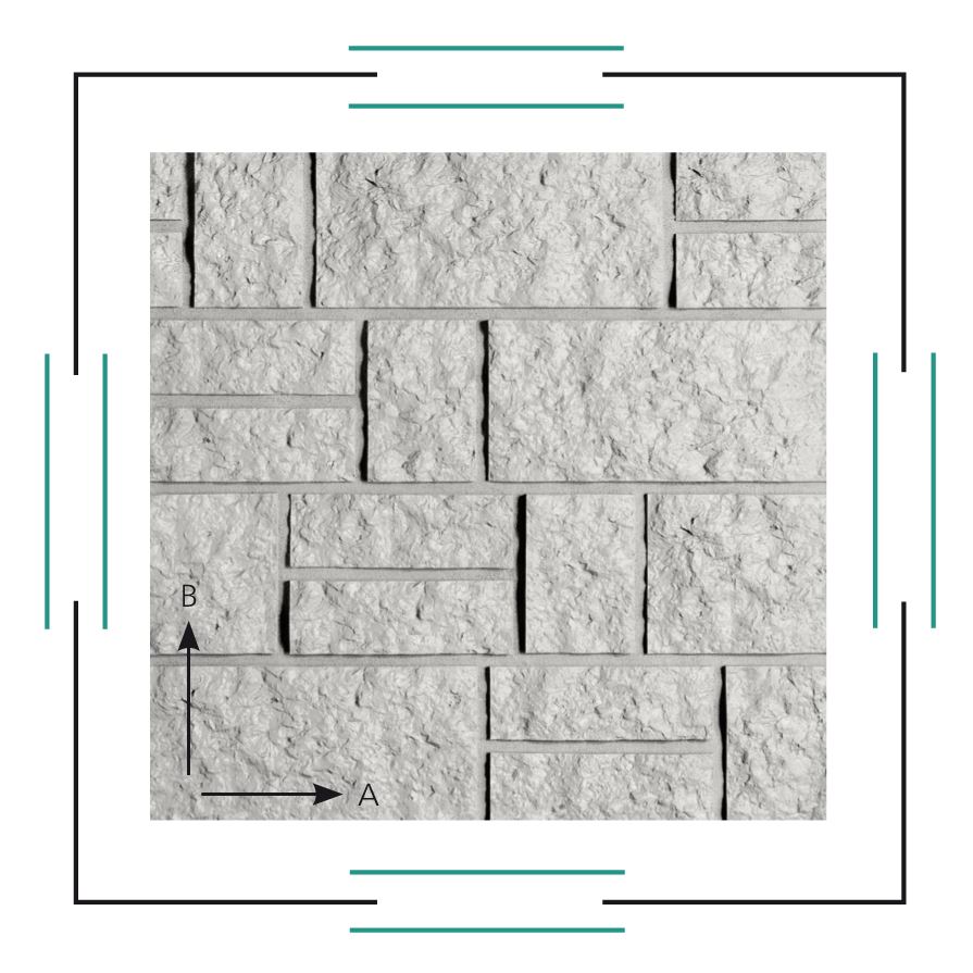 Wzór muru z kamienia o zróżnicowanych formatach; idealny, gdy zależy Ci na naturalnym, spokojnym rytmie kamiennej powierzchni na jednolitym betonie.