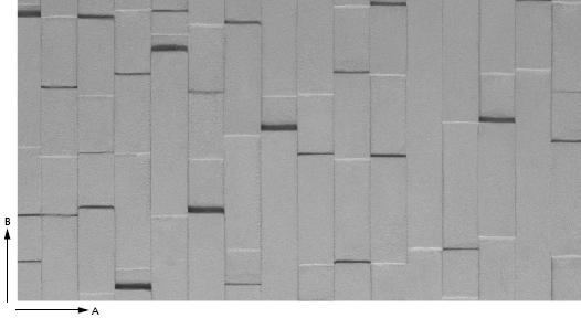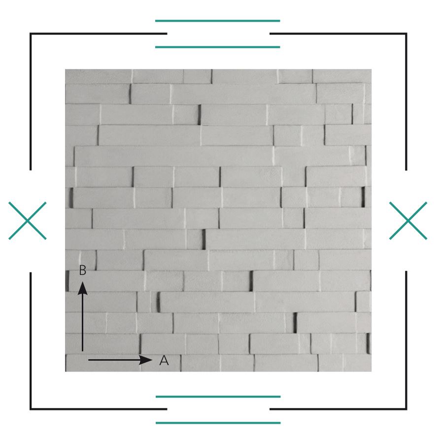 Trójwymiarowa struktura do układania poziomo lub pionowo. Nieregularnie rozmieszczone prostokąty o wysokości ok. 63 mm i chropowatej powierzchni tworzą urozmaicony relief oraz ciekawą grę cieni. (Wzór w katalogu pokazany w obrocie o 90°).