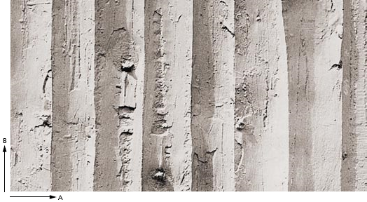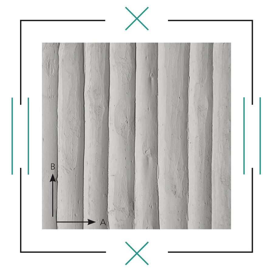 Odcisk obłupanych pni drzew w betonie. Pnie są cięte wzdłuż i mogą być stosowane również "na leżąco", dając naturalny, organiczny rysunek.