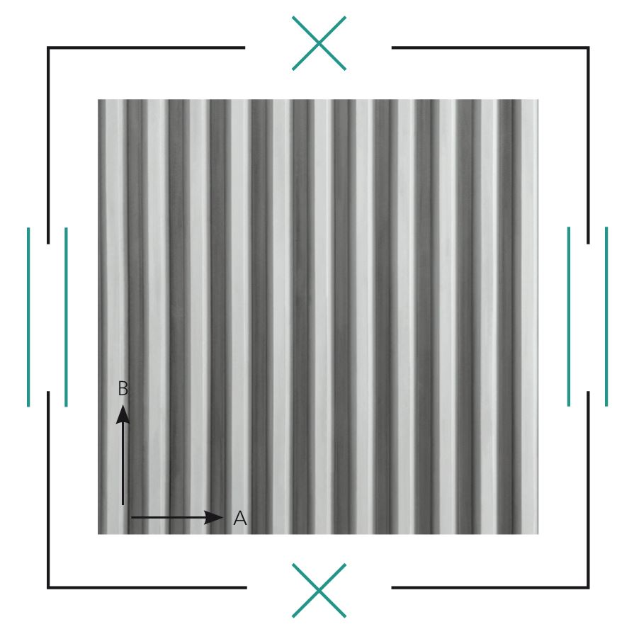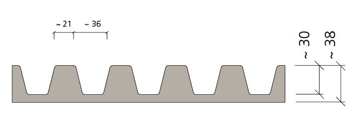 Trapezowy relief z "promieniście" prowadzonymi narożami. Ułatwia technicznie czyste rozformowanie bez wykruszeń na krawędziach.