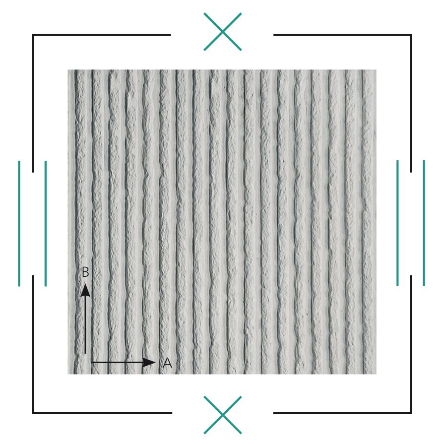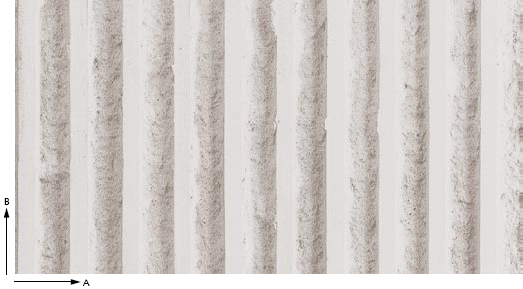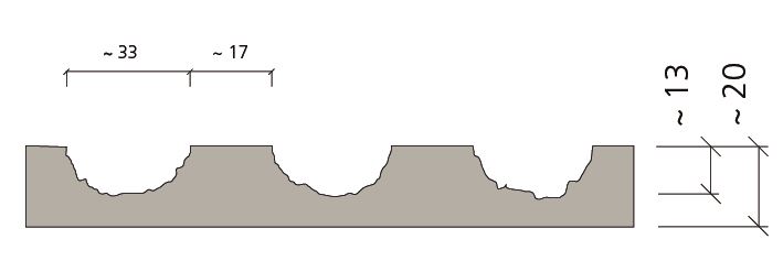 Struktura z grupy wzorów inspirowanych betonem groszkowanym. W porównaniu do trapezowych wariantów tej serii żebra są drobniejsze, bardziej zaokrąglone i mniej wyniesione.