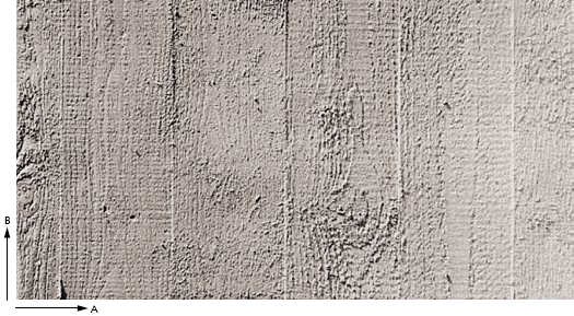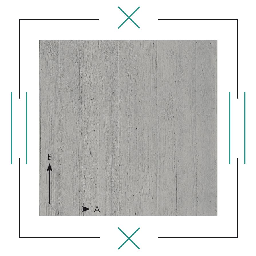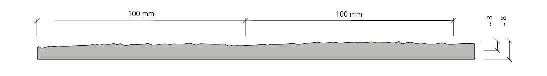 Struktura z desek świerkowych ciętych na grubo (szer. 100 mm). Ponieważ deski celowo nie były ostro heblowane, szczeliny między nimi są raz mocniejsze, raz delikatniejsze; zróżnicowana grubość desek tworzy dodatkowe uskoki.