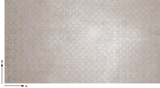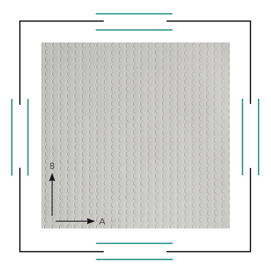 Struktura "guzkowana"/wypustki zapewniająca właściwości antypoślizgowe R12 (wg DIN 51130). Wymiar maty A = stały.