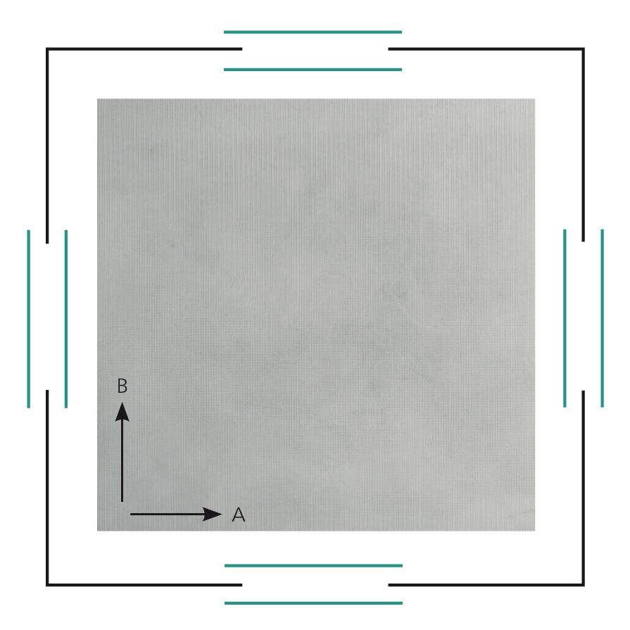 13 piramidek o podstawie 3 mm i wysokości 1 mm. Klasa antypoślizgowości R12 (wg DIN 51130). Matrycę trzeba zamawiać w pełnym rozmiarze (nie wykonuje się mniejszej), ale możliwe są przycięcia. Nie można łączyć na styk. Wymiary maty A i B = stałe.