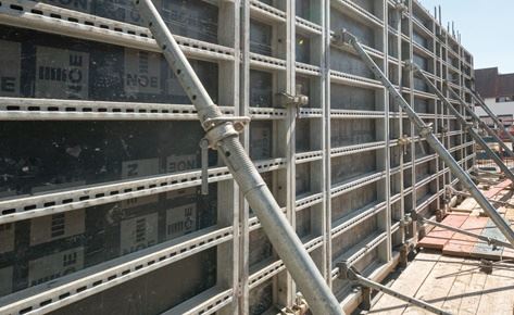 Mowa tu o szalunkach ściennych, które, ze względu na swoje zalety, sprawdziły się już na wielu budowach. Jedną z tych zalet jest szeroka gama systemów płyt w różnych rozmiarach. Systemem, który wyróżnia się najbardziej jest system XXL. Panele o rozmiarach 5.30 x 2.65 m to jedne z największych płyt szalunkowych dostępnych na rynku. Dla budowniczych oznacza to, że mogą uzyskać na placu budowy szalunek o powierzchni ponad 14.00 m2 przy użyciu tylko jednego elementu. W przypadku Apostelhof BA2 ten system deskowań był głównie używany do budowy ścian sklepów oraz podziemnego parkingu. Producent szalunków oferuje wyjątkowo praktyczne rozwiązanie, to jest wiele uzupełniających NOEtop systemów, takich jak szalunki słupowe NOEtop FS, które pomagają w wydajnym prowadzeniu prac na placu budowy.