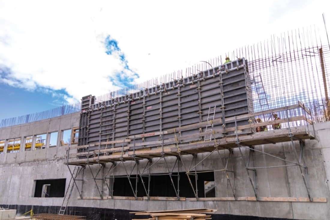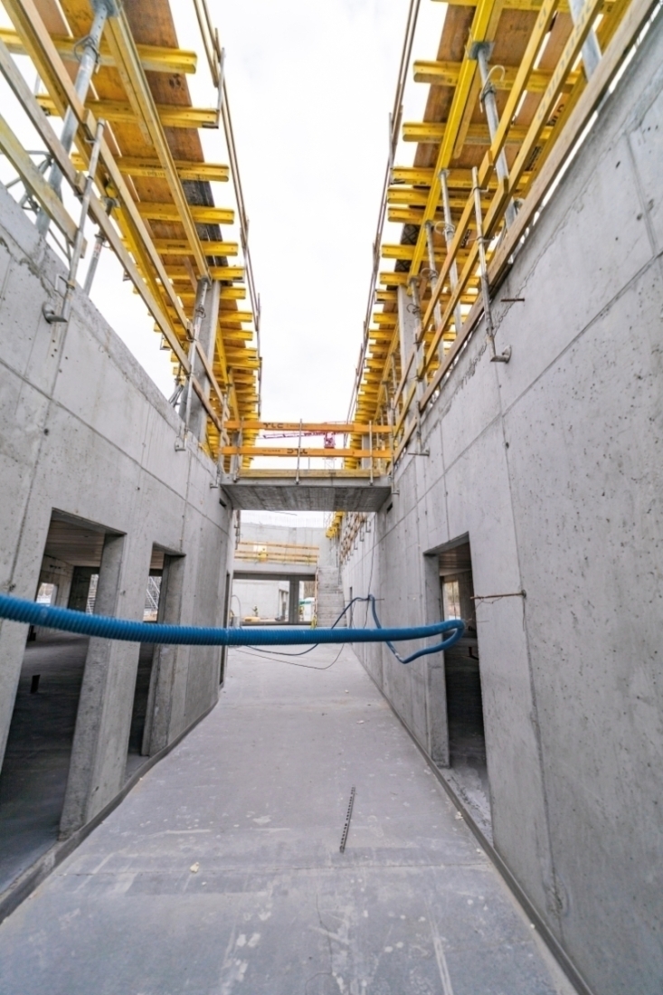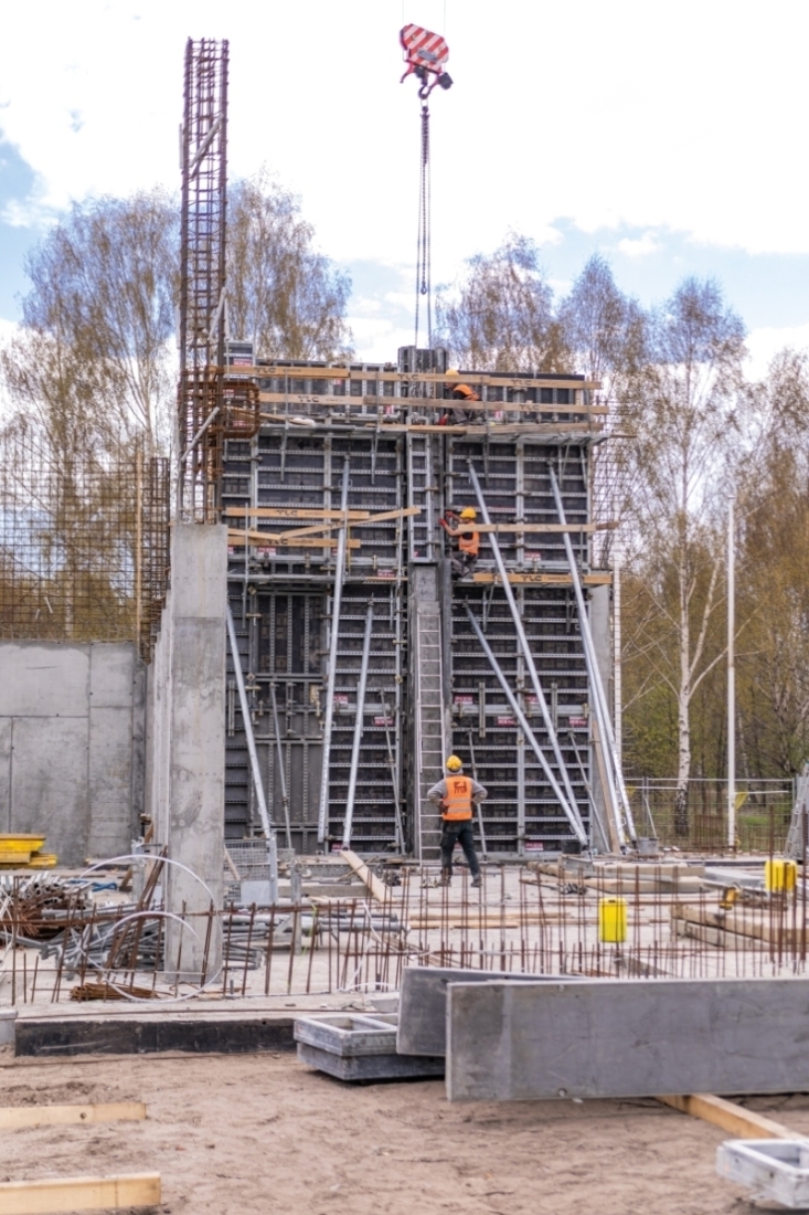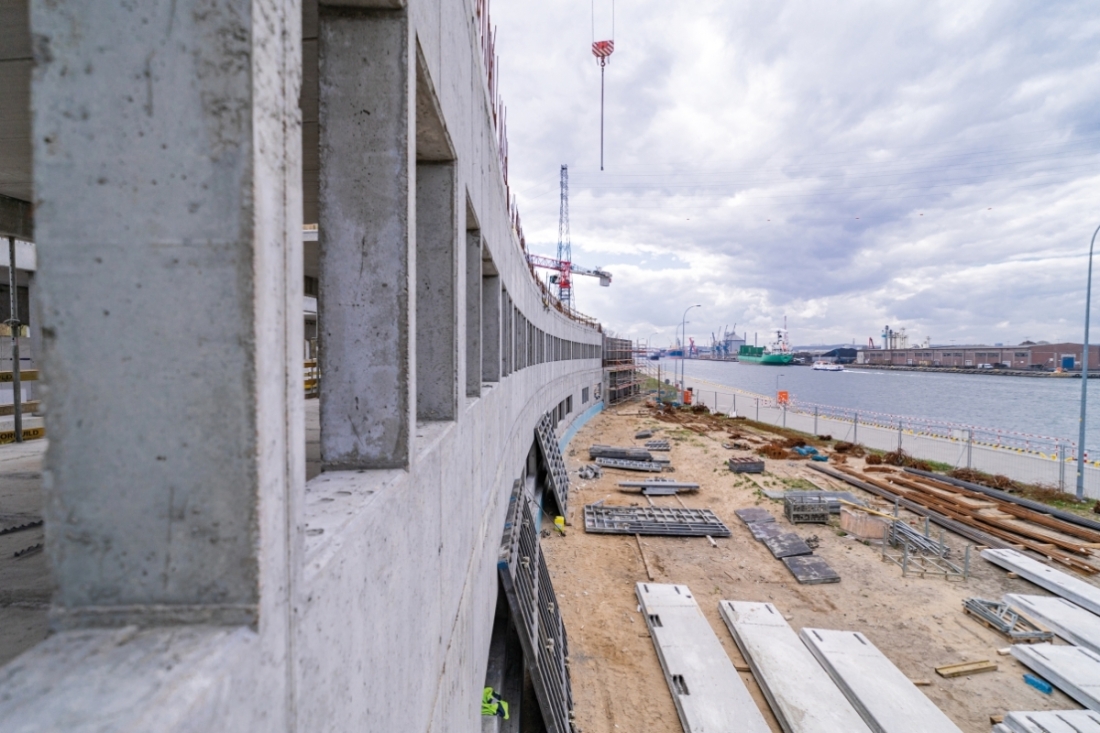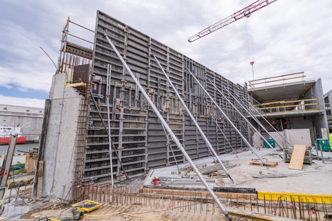 7-metrowej wysokości ściany łukowe uformowane z NOEtop na budowie Centrum Offshore w Porcie Gdańsk