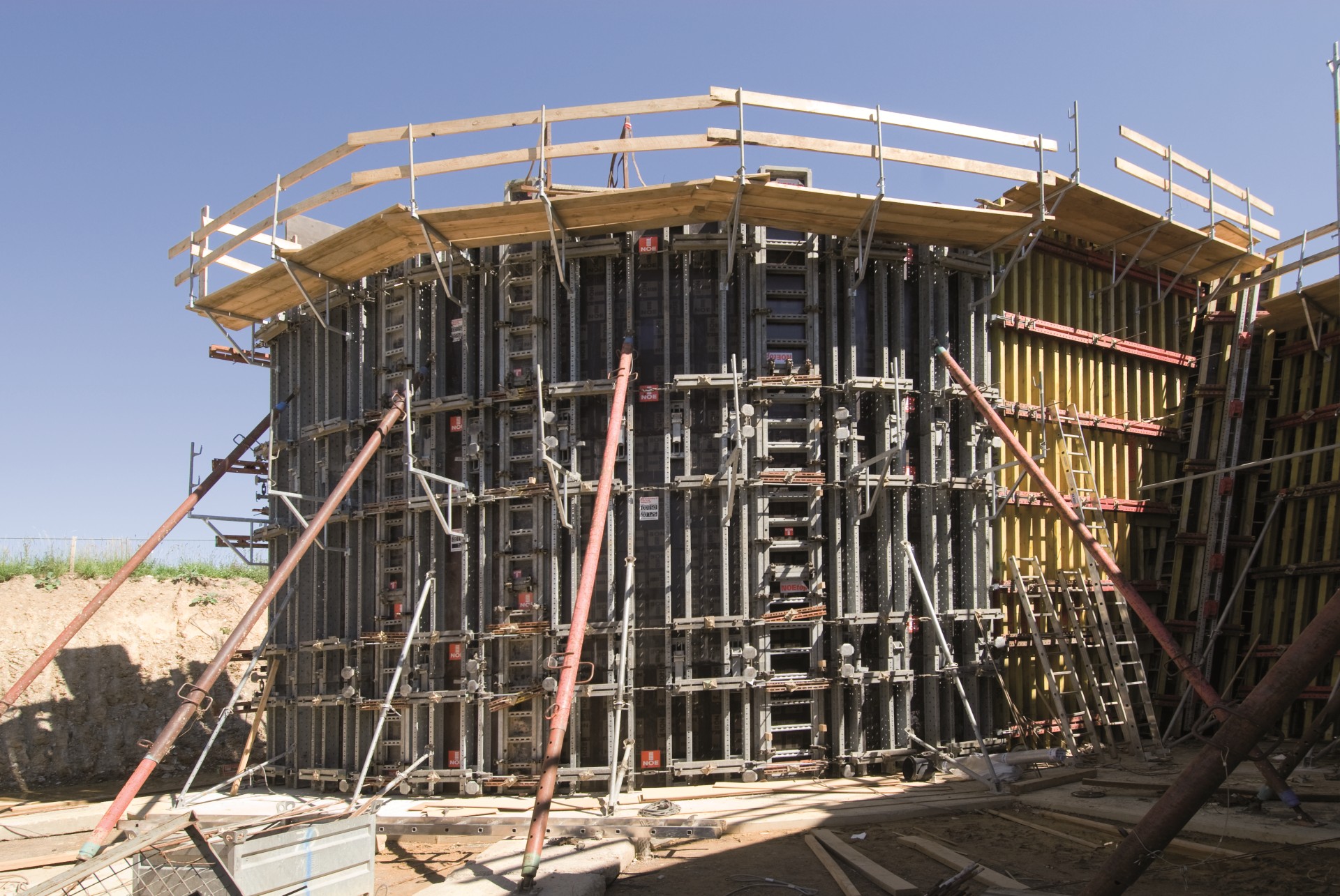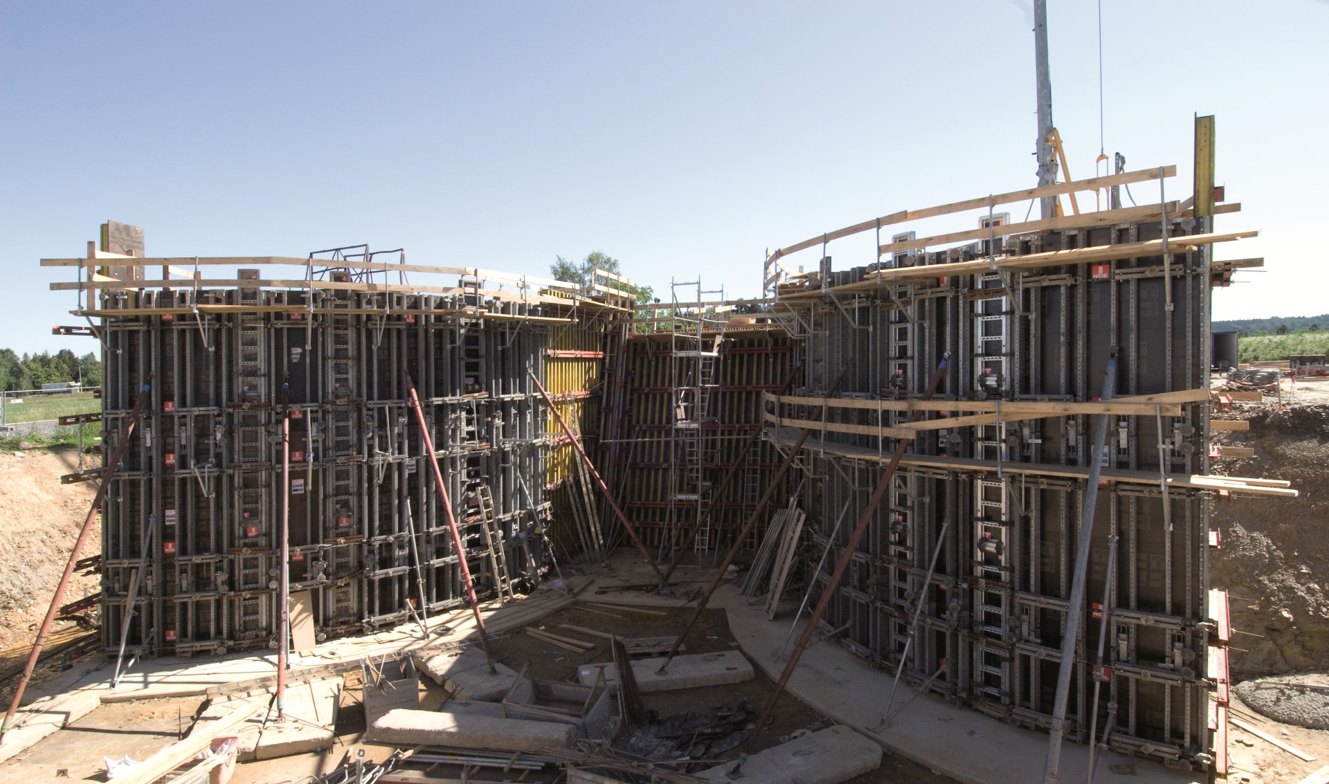 Nachylone słupki ramy były utrzymywane w wymaganej pozycji przez 20 przęseł podporowych NOE Combi z zastrzałami pionującymi/BKS; do nachylonych i zaokrąglonych ścian tylnych wykorzystywane były prefabrykowane elementy specjalne, dołączone analogicznie do szalunku standardowego.