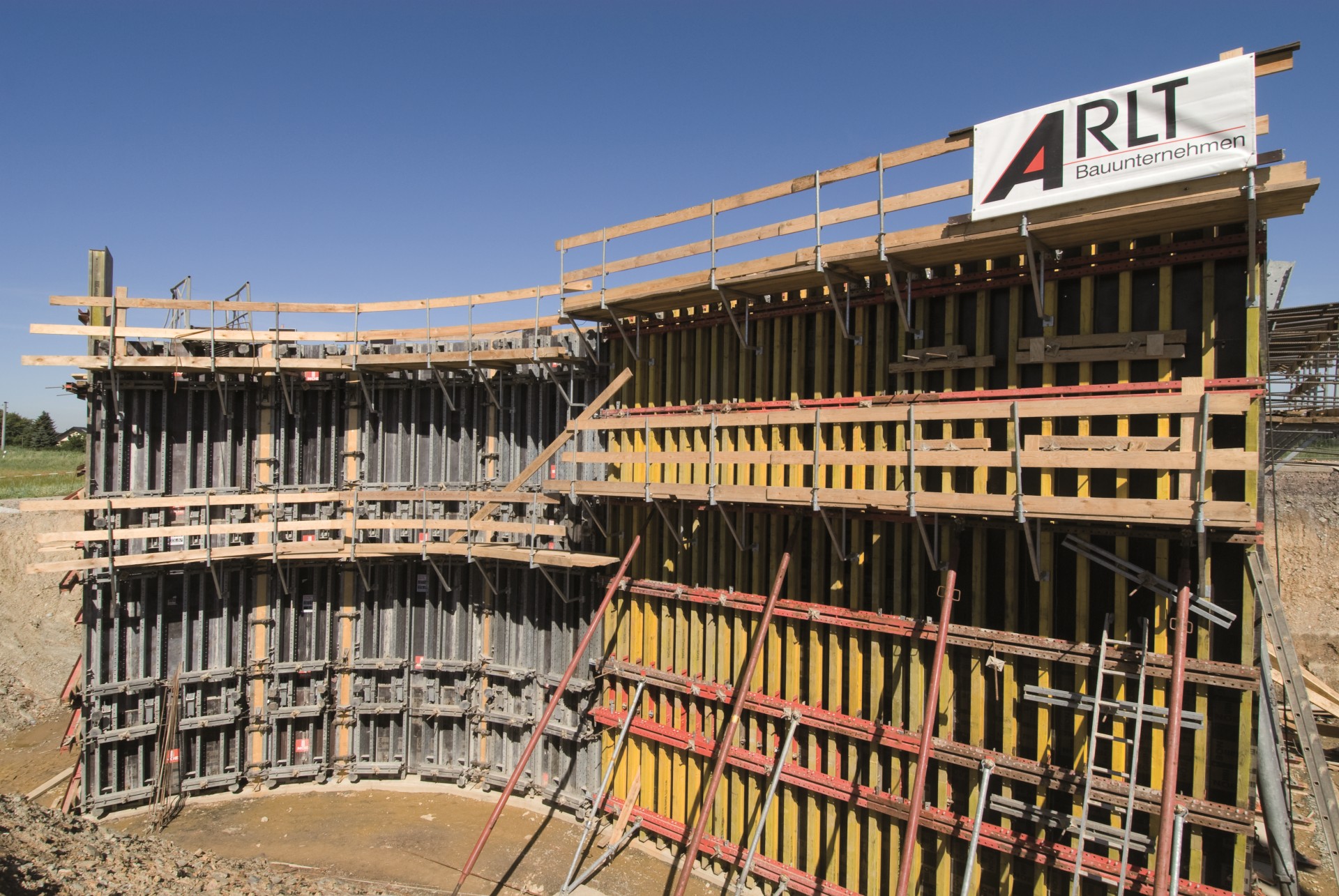 Aby potrzeby materiałowe były utrzymane na możliwie niskim poziomie, pracownicy Arlt stosowali szalunek zgodnie z planami prac opracowanymi przez NOE-Schaltechnik. Oznaczało to, że najpierw szalowali i betonowali przyczółek z prostymi ścianami, następnie dla drugiego przyczółka przeniesiono w całości część przednią i uzupełniono ją o szalunek okrągły. Szalunek, za wyjątkiem listew trójkątnych, był w całości przygotowany do pierwszego użycia. Pomocą przy pozycjonowaniu tych elementów strukturalnych było zaznaczenie położenia już w fabryce, co pozwoliło na rezygnację z czasochłonnego wyznaczania na placu budowy.