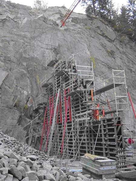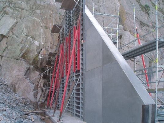 Najważniejszą cechą betonu samo - zagęszczanego jest bardzo wysoka płynność, rozlewność, samo - odpowietrzanie i homogeniczność. Bez żadnych zabiegów mechanicznych można taki rodzaj betonu wprowadzać do ścian uformowanych w deskowaniu I wypałniać nim najdalsze zakamarki takich form. Dla deskowań oznacz to konieczność uzyskania wysokiej jakości powierzchni oraz zdolność do przeniesienia wysokich obciążeń lennej mieszanki betonowej . W miejscowości wykonywała Firma Doll GmbH & Co. KG z Bad Peterstal nowe ściany zbiorników. Ściany grubości 40 cm miały wysokość 10 m i długość 20 m i trójkątny kształt. Wprowadzony do deskowania beton samo - zagęszczany pozostawała w nim do czasu pełnego związania w stabilną bryłę betonową. Dla zastosowania tej nowej technologii mieszanek betonowych potrzebne były doświadczenie i nadzór naukowców z Politechniki Darmstadt. Wybierając NOEtop postawiliśmy na właściwego konia - mówi Firma Doll, ponieważ to deskowanie jako jedyne oferuje tarcze o największych wymiarach 5,30 x 2,65 m oraz przenosi obciążenie mieszanką betonową do 88 kN/m2. Takie obciążenia mogą być przeniesione prze to deskowanie niezależnie od kombinacji zastosowanych tarcz. W trakcie pracy zastosowano 680 m2 tego najnowocześniejszego deskowania. "Nawet ekstremalne obciążenia parciem świeżej mieszanki betonowej nie zmieniło stabilności ścian formowanych z tarcz wyposażonych w zintegrowane z nimi pasy montażowe" relacjonował Kierownik Budowy Dipl.-Ing. Rolf Weigold. Doświadczenia w stosowaniu deskowania ścian NOEtop dla realizacji z samo - zagęszczanymi mieszankami betonowymi wykazały, że przy zachowaniu zgodnej z obciążeniem prędkości wypełniania ścian płynnym betonem ten typ deskowania jest właściwym urządzeniem formującym takie betony.