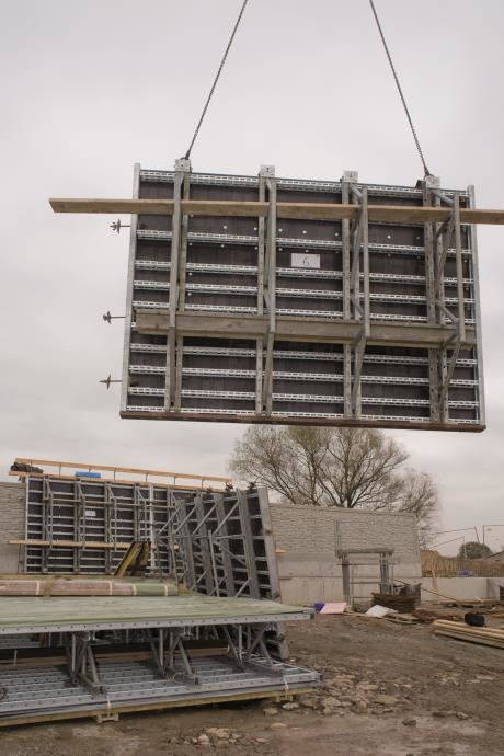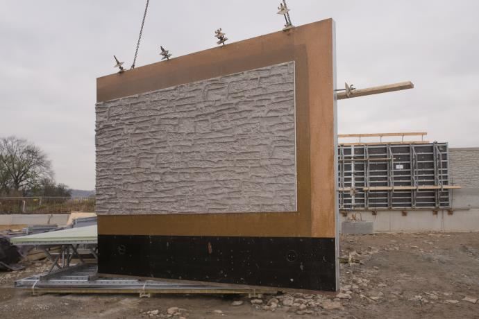 Aby przyśpieszyć prace, budowniczowie wykorzystali usługę, którą NOE oferuje jako jedyna firma produkująca szalunki i matryce strukturalne: na życzenie klienta NOE przejmuje montaż matryc strukturalnych na płytach nośnych i umieszcza je potem na podstawowym szalunku jako elementy gotowe do zastosowania. Dla wykonawcy robót budowlanych ma to tę zaletę, że stawia się już tylko zamontowane gotowe elementy i nie tracąc czasu można szybko rozpocząć pracę. Ta usługa firmy NOE stosowana jest coraz częściej przede wszystkim na budowach, na których masa betonowa układana jest na miejscu.
