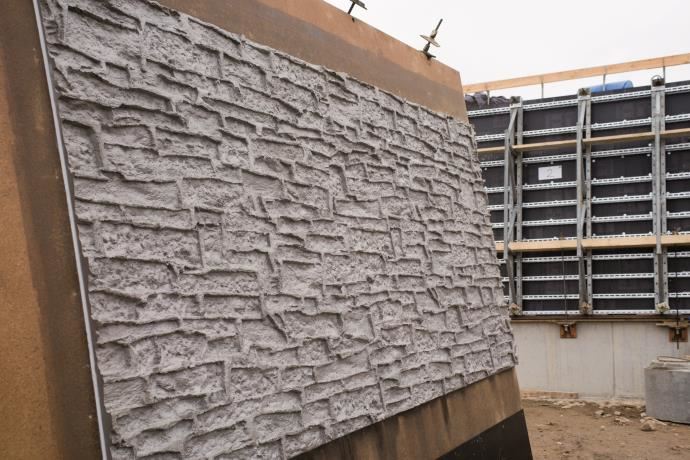 Betonowy mur przeciwpowodziowy, wykonany przy wykorzystaniu matryc strukturalnych NOEplast, zachwyca swym wyglądem