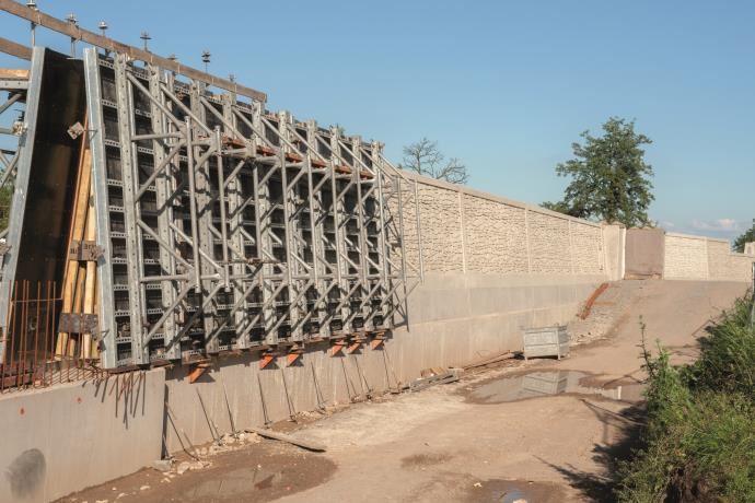 W widocznym obszarze nie powinny znaleźć się kotwy, dlatego też zastosowano NOE Combi 70. Ten wytrzymujący duże obciążenia system szalowania oparty jest na ocynkowanym usztywnieniu dźwigarów kratowych o wysokości budowlanej wynoszącej 70 cm, montowanych - w zależności od istniejącego obciążenia - w odstępach 100-150 cm. Właściwy element szalunku składa się z rusztu wykonanego z szyn szalunkowych i pionowych skrajnych profili NOEtop, które montowane są na poszyciu szalunku od strony terenu o grubości 21 mm. Na tych elementach umieszczane mogą być wszelkie możliwe motywy, widoczne potem na powierzchni danej budowli, które przykręcane są śrubami od tyłu. Szczególną cechą tego systemu jest fakt, że spinanie konieczne jest tylko na zakończeniach dźwigarów kratowych na górze i na dole. W przypadku wału przeciwpowodziowego w Cossebaude rozwiązanie ma tę zaletę, że konieczne to było tylko 10 cm powyżej fundamentu i na wysokości ok. 290 cm, powyżej ściany. Tym samym nie były potrzebne dodatkowe prace wykończeniowe w obszarze matryc szalunkowych. Filia firmy NOE dostarczyła na budowę gotowe do użycia zamontowane elementy szalunku, fabrycznie zaopatrzone w matryce i gładkie okładziny, łącznie ze wszystkimi rozwiązaniami specjalnymi. Elementy te miały maksymalną wielkość 300 x 512,5 cm, a więc np. segmenty ściany o długości 9,60 m można było betonować, używając jedynie dwóch elementów szalunku.