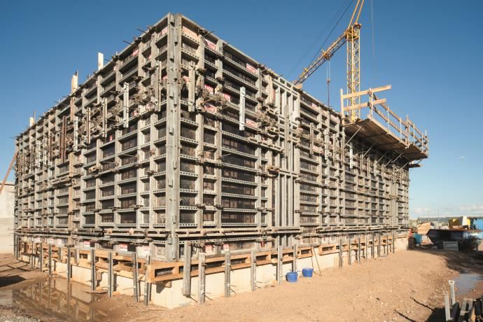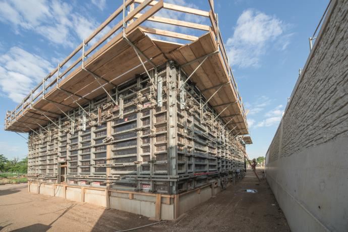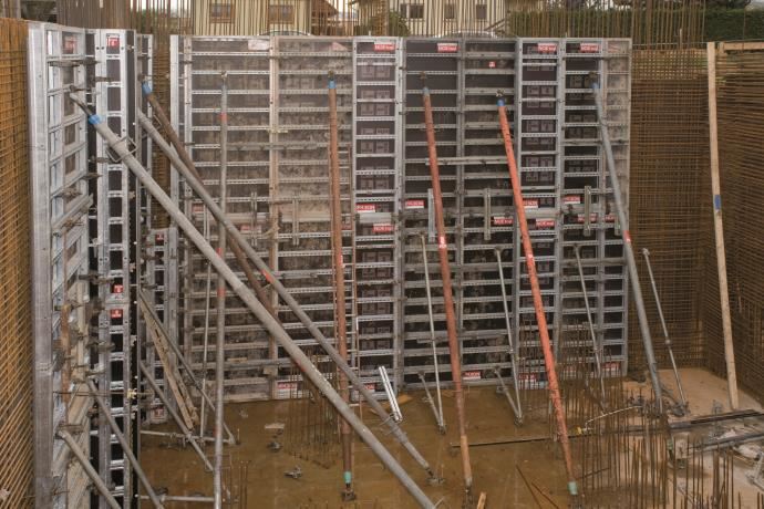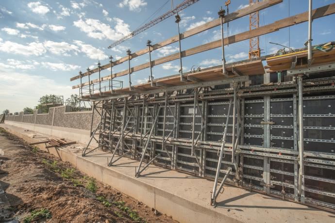 To oznacza, że do realizacji obiektu z 34 różnymi typami segmentów potrzebne było tylko 6 standardowych kompletów szalunków, które zostały uzupełnione jedynie przez 3 optymalnie dostosowane, specjalne rozwiązania systemowe, zastosowane zgodnie z geometrią muru i koncepcją realizacji.
