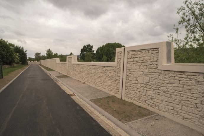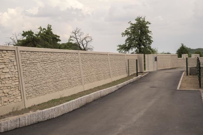 Betonowy mur przeciwpowodziowy, wykonany przy wykorzystaniu matryc strukturalnych NOEplast i systemu usztywnień NOE Combi 70, zachwyca swym wyglądem i przypomina mur z kamienia naturalnego.