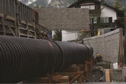 Chociaż nowe koryto rzeki wygląda pięknie, to jednak niewielu obserwatorów się domyśla, jak skomplikowane było jego zbudowanie. Z 40 elementów konstrukcyjnych każdy był inny i szalunek musiał być w każdym miejscu rozwiązywany indywidualnie. Jednym z powodów było to, że ściany betonowe koryta rzeki są zagięte w dwóch płaszczyznach: po pierwsze ? po to, aby śledzić bieg rzeki, która wije się przez miejscowość, i po drugie ? aby naśladować przekrój rynny w kształcie litery U. Do tego doszło utrudnienie w postaci naturalnego pagórkowatego ukształtowania terenu i pochylenia koryta rzeki: ściany rynny rzecznej zbudowano przy pomocy matryc strukturalnych, górne krawędzie ścian tworzą zaś tzw. murowaną koronę o wysokości 40 cm. Ta przystosowuje się do przebiegu terenu, podczas gdy druga strona muru dostosowuje się w swej wysokości do kąta nachylenia rzeki. Na skutek tego ściany boczne koryta rzeki wykazywały w każdym miejscu inną wysokość. Aby uzyskać przyjemne wrażenie ostateczne, pracownicy firmy wykonawczej, Teerag-Asdag Aktiengesellschaft, pod kierownictwem regionu Roppen, Austria, zadbali najpierw o to, aby matryca strukturalna NOEplast zwięźle łączyła się z dolną krawędzią cokołu. Musieli przy tym cały czas bardzo uważać na to, aby poszczególne rzędy muru były równomiernie kontynuowane. Mimo to udawało się im używać matryc szalunkowych do 60 razy. Na skutek różnej wysokości ścian zdarzało się od czasu do czasu, że matryca była u dołu o kilka centymetrów za krótka i beton był w tym miejscu gładki. Tego jednak właściwie nie widać, ponieważ w korycie rzeki układano bloki z naturalnego kamienia, które i tak przykrywają tę część ściany.