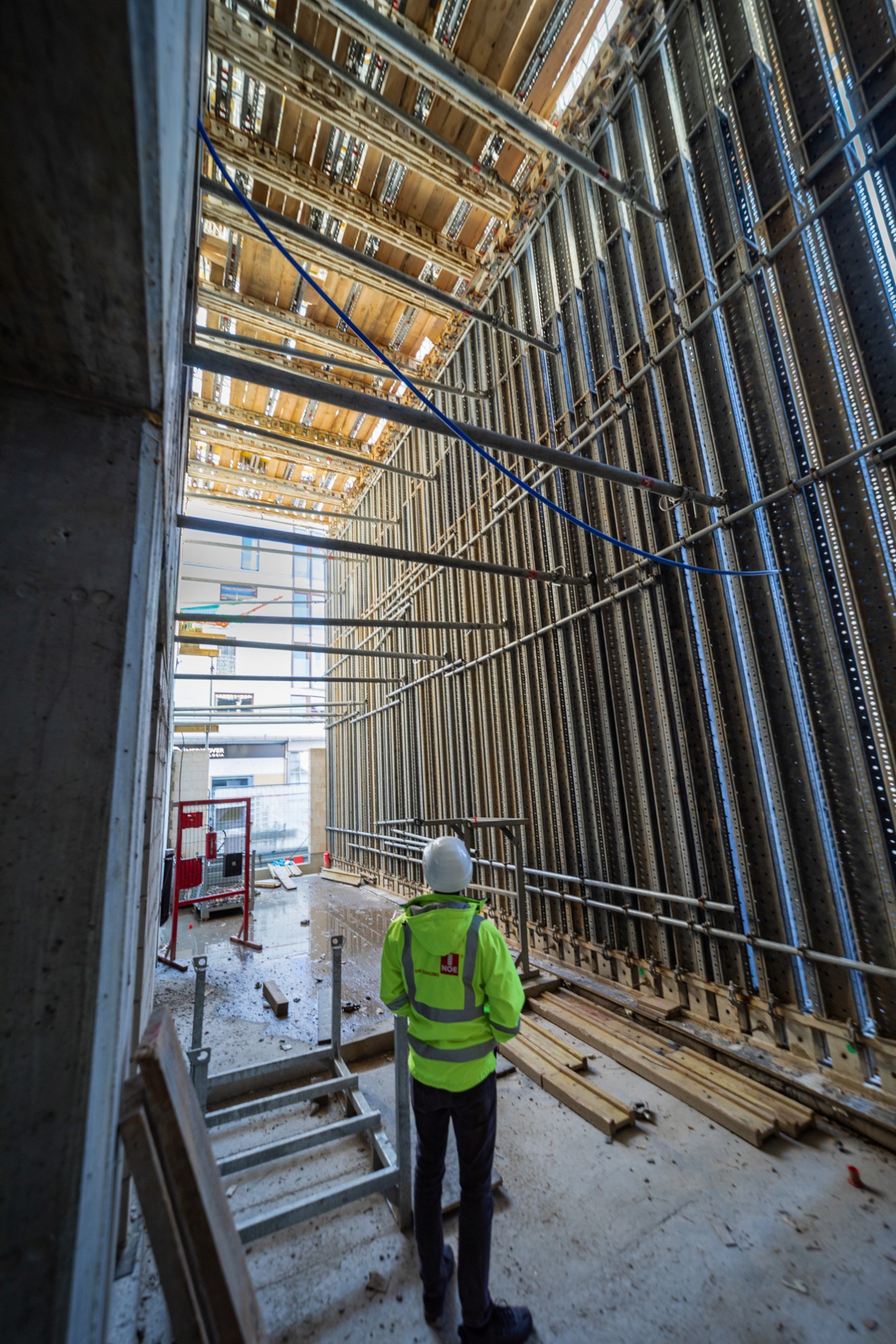 Rozwiązaniem stał się układ tymczasowy oparty na modułowych dźwigarach mostowych NOEtec oraz wysokonośnych podporach NOE LS 200, o nośności do 200 kN każda. System umożliwił realizację dużych rozpiętości, zapewniając jednocześnie pełną kontrolę ugięć, stateczności przestrzennej i redystrybucji sił w trakcie betonowania