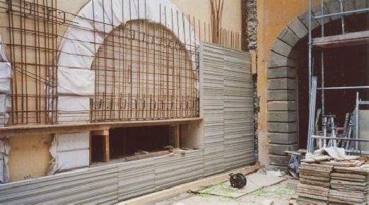 Angermuseum w Erfurcie wyróżnia się dziedzińcem wewnętrznym, wokół którego tworzą się bryły budynku pełniące kiedyś różne funkcje. Południowe, otwarte w kierunku dziedzińca wewnętrznego skrzydło kompleksu stanowiło niegdyś schronienie dla koni. W trakcie przebudowy w 1999 roku zostało ono zamknięte ścianą żelbetonową. W ścianę wbudowano trzy duże okna łukowe. Dzisiaj w pomieszczeniach tych przechowywane są grafiki, rysunki oraz druki artystyczne, które w miarę możliwości powinny być chronione przed dostępem światła. Z tego względu konieczna była zmiana struktury otworów. Po kilku eksperymentach z różnymi materiałami budowlanymi planiści zdecydowali się na strukturalny beton licowy, którego powierzchnia powinna przypominać o nawarstwionych paspartach, względnie ramach obrazów. Na początku pracownicy biura Worschech planowali wykonanie ściany o wysokości 33 m i 12 m na miejscu. Jednak trudne warunki przyczyniły się do tego, że planiści wraz z realizującym prace przedsiębiorstwem budowlanym Ebert Bau Berga GmbH & Co musieli szukać alternatywnego rozwiązania. Zdecydowano się na niekonwencjonalną, wielowarstwową konstrukcję ściany składającą się z jednej dodatkowej warstwy izolacyjnej, warstwy betonowej wykonywanej na miejscu oraz prefabrykowanych płyt betonowych, które powstały jako filigranowe elementy. Zostały one wycentrowane jedna na drugiej i z powrotem zakotwiczone pionowo na istniejącej ścianie przez przedsiębiorstwo budowlane Ebert Bau. Ponieważ elementy betonu licowego wyprodukowane zostały w zakładzie prefabrykatów, istniały dobre warunki na uzyskanie wysokiej jakości powierzchni.
