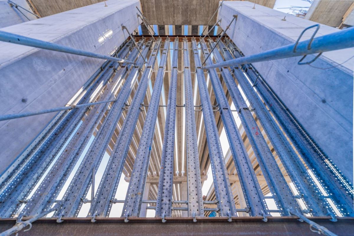 Kolejnym wyzwaniem postawionym przez budowę było podparcie płyty ustroju które miało być zawieszone do 15 m nad ziemią, przenosiłoby obciążenia z żelbetowej płyty ustroju na znajdujące się poniżej belki prefabrykowane oraz zapewniało maksymalną ochronę dla pracowników wykonujących swoje obowiązki na krawędziach konstrukcji. Wybór padł na modułowy system NOE DVL obejmujący wiele różnych elementów umożliwiających łączenie szyn NOE C10 i NOE C20 oraz tradycyjnych dźwigarków NOE H20 w większe elementy wsporcze.