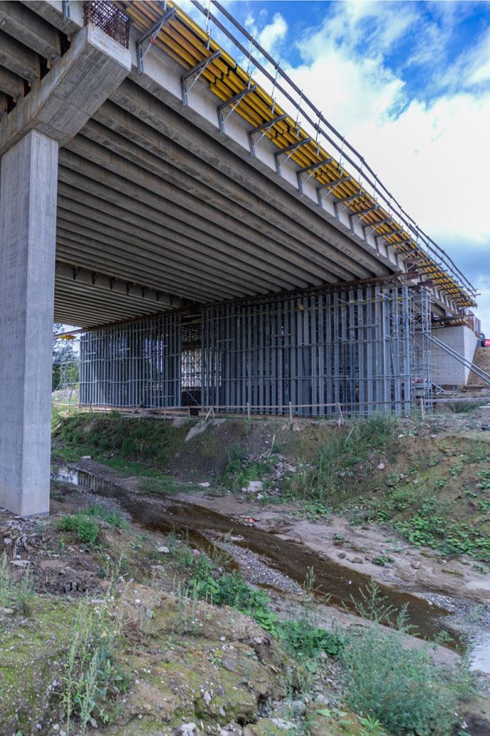 Na jednej z 7 osi podparcia ustroju nie można było oprzeć belek prefabrykowanych na łączącej filary poprzecznicy. Konieczne było przeniesienie całego obciążenia z 64 prefabrykowanych belek "T" o długościach dochodzących do 27 metrów na fundamenty. Idealny okazał się system wysokonośnych podpór z systemu NOE LS200. Każda podpora NOE LS200 jest w stanie, w zależności od długości, przenieść obciążenie do 200 kN. Konstrukcję wsporczą uzupełniono o HEBy łączące cały układ oraz podnośniki klinowe, które umożliwiły łatwiejszy demontaż po zakończeniu prac.