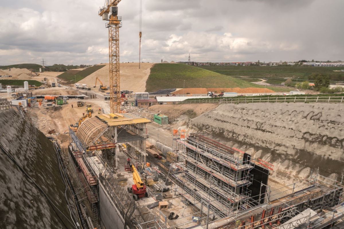 W portalu o długości około 50 m zastosowano wózek szalunkowy NOEtec. Po betonowaniu pierwszej nawy wózek szalunku został przeniesiony do drugiej. Wdrożenie odbyło się w zaledwie 15 minut i zostało z góry zaplanowane przez istne arcydzieło logistyczne. Spowodowało to znaczną oszczędność czasu i kosztów. Do ścian bocznych zastosowano szalunek wielkopowierzchniowy NOEtop, a do poprzeczek szalunek ścienny NOEalu L.Klient:
