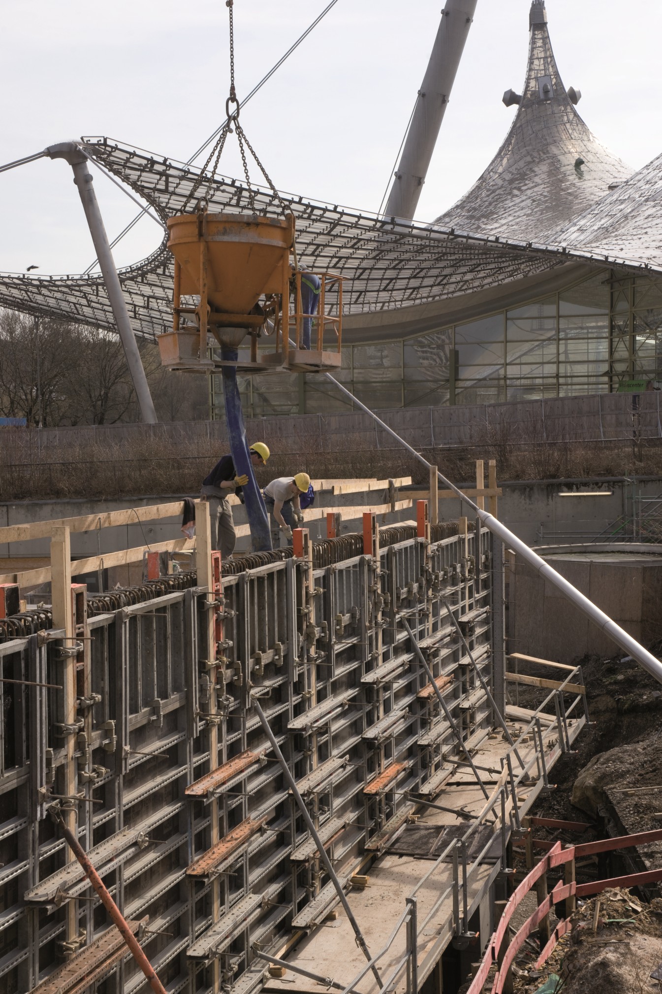 Budowa Parku Olimpijskiego w Monachium została zrealizowana przed 38 laty. Mianem "tworzywa marzeń" określano wówczas: szkło akrylowe do tzw. "dachu namiotowego". To ówczesne marzenie architektoniczne zrealizowane na potrzeby niezwykle radosnego wydarzenia sportowego do dziś cieszy się sympatią ze względu na wyjątkowy krajobraz architektoniczny, jest również uznawane za najważniejszy teren rekreacyjny w Monachium. Jednakże, ten chroniony obiekt starzeje się. Dlatego, na jego terenie prowadzone są aktualnie prace z zakresu renowacji i modernizacji, których koszt wynosi 65 mln euro, kompleks ten powiększy się również o nowe, podziemne pomieszczenie widowiskowe wykonane z betonu elewacyjnego. System sprężeń: NOEtop ze zintegrowanym pasem montażowym. Dzięki temu dopracowanemu systemowi sprężeń możliwe było zachowanie odpowiedniej precyzji przy realizacji zaplanowanego przez architektów efektu zakotwiczenia.