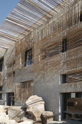 Powierzchnie fasad budowli w przeważającej części tworzy strukturalny beton architektoniczny, ukazujący relief o wyglądzie wiązek trzciny. W ten sposób architekt przypomniał o 700-letniej tradycji budownictwa w Camargue. Bazuje ono na wykorzystywaniu trzciny jako organicznego materiału budowlanego i stąd w przeszłości stanowiła źródło przychodów dla kobiet. Ponieważ głównie ich zadaniem były wyprawy na bagna i zbieranie tam łodyg trzciny. Po ścięciu sierpem z długim uchwytem trzcina była transportowana łodzią na ląd, gdzie następnie była układana w wiązki i wiązana sznurem lub drutem. To organiczne tworzywo można było wykorzystywać do krycia dachów, do izolacji, a nawet do wznoszenia ścian. Elementy budowlane wykonane z tego materiału często miały charakterystyczny relief. I właśnie ten motyw przejął architekt François Fontes i zbudził do nowego życia na wykonanych z betonu architektonicznego fasadach kompleksu budowli we Francji. Przy realizacji tego niezwykłego wyglądu powierzchni w betonie zastosował on matryce strukturalne NOEplast firmy NOE-Schaltechnik.