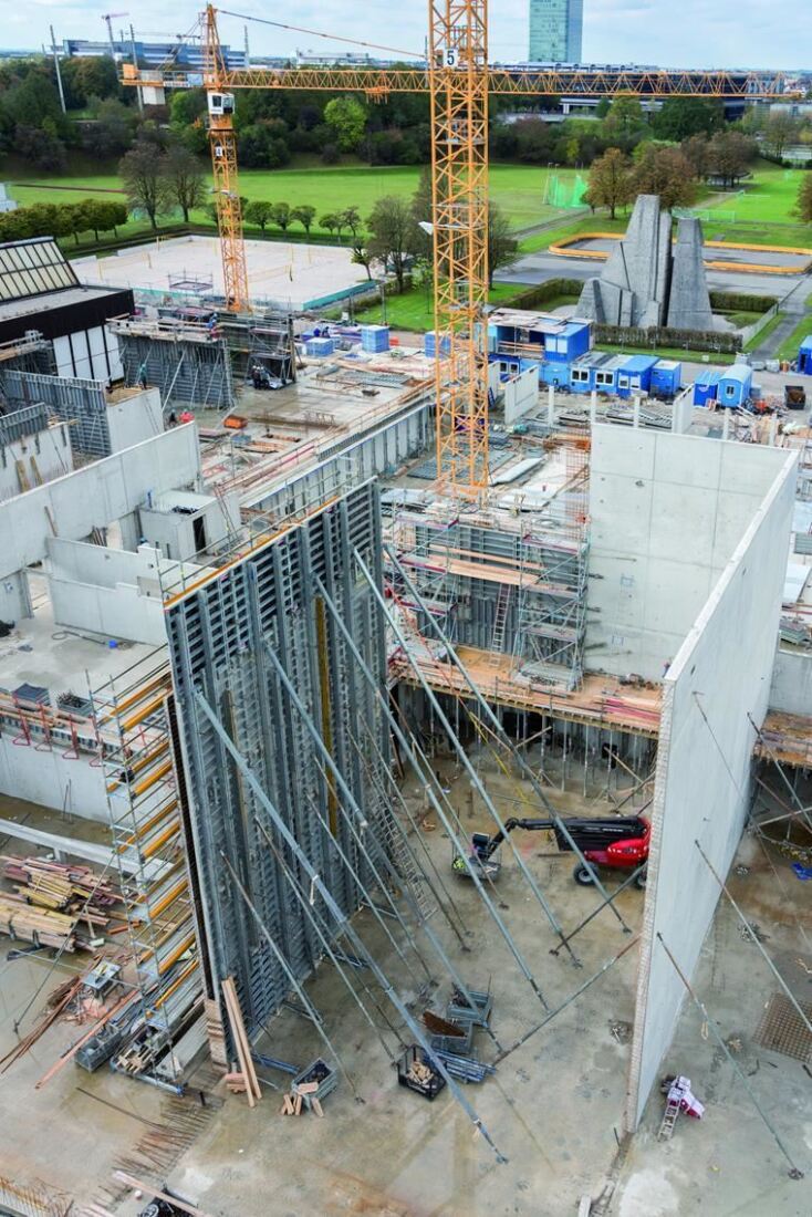 Ogłoszono konkurs a wygrali go architekci z Austrii- Dietrich Untertrifaller oraz Balliana Schubert. Ich projekt przewidywał gigantyczny nowy budynek z sześcioma wewnętrznymi patio. Miał być zbudowany głównie z drewna i szkła oraz gdzieniegdzie z betonu licowego. Drugi etap budowy ukończono z końcem 2018 roku. Firma Grossmann Bau z Rosenheim bardzo się przyczyniła do tego sukcesu. Zleceniobiorca przeprowadził wszystkie prace inżynierii lądowej oraz budowlanej, to jest roboty ziemne, doprowadził kanalizację, zbudował system odwadniający oraz postawił budynki. Oznaczało to, że średnio 75 do 80 a w godzinach szczytu nawet 100 pracowników pracowało jednocześnie na budowie. Firma od wielu lat korzysta z systemu szalunków NOE-Schaltechnik przy pracach z betonem. Tak też się i stało w przypadku prac budowlanych w Parku Olimpijskim. Najważniejszym systemem NOE-Schaltechnik na tej budowie były ścienne szalunki NOEtop. Jedną z wielu zalet tego systemu jest jego wszechstronność. Zintegrowane pasy mocujące systemu NOEtop pozwalają na stosowanie go jako szalunków ramowych lub zamiast szalunków dźwigarkowych. Kontrahent używając tego systemu ma możliwość wyboru pozycji ściągów. Producent produkuje ten system w różnych rozmiarach. Jednym z nich jest wersja XXL, która pozwala na wylanie bez łączeń powierzchni ponad 14 m2. To tej wersji głównie używano na placu budowy w Monachium przy składaniu elementów szalunków o wysokości 2,65 m oraz 3,31 m.