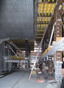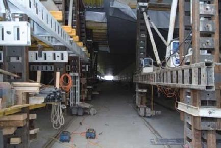 Po zabudowaniu płyty dennej o grubości 1,10 m rozpoczęto budowę tunelu o kon-strukcji monolitycznej ścian i stropu, betonowanej w systemie nieprzerwanym. Dwa przemieszczające się równolegle szalunki samojezdne o wymiarach wys. 7 m x dł.10 m, znalazły zastosowanie podczas budowy tunelu o szerokości w świetle wynoszącej 11,35 m. Dźwigary, zastrzały, zamki łączące i sworznie są dominującymi elementami szalunku samojezdnego w systemie modułowym NOEtec. Konstrukcja stalowa łą-czona jest błyskawicznie za pomocą sworzni - bez uciążliwego skręcania śrub, wstawione dźwigary H 20 uzupełniają szalunek do wstawienia płyt szalunkowych. Jest to nadzwyczaj elastyczny system, w którym stalowe dźwigary przejmują funkcję statyczną, a dźwigary drewniane H 20 wsunięte w otwory w dźwigarach stalowych stają się wspornikami dla płyt szalunkowych. Olbrzymia zaleta systemu szalunkowe-go NOEtec: szalunek ścian i stropu tunelu oraz rusztowanie wsporcze budowane są w jednym systemie składającym się w całości z elementów, które można wynająć. A ponadto stalowy dźwigar, w który wsuwa się i klinuje drewniane dźwigary H 20, "oczarowuje" niewiarygodną stabilnością i wytrzymałością, które odpowiadają profilowi IPE 300. Brygadzista firmy NOE-Schaltechnik wraz z trzema cieślami z konsor-cjum montują szalunki samojezdne w minimalnym czasie.