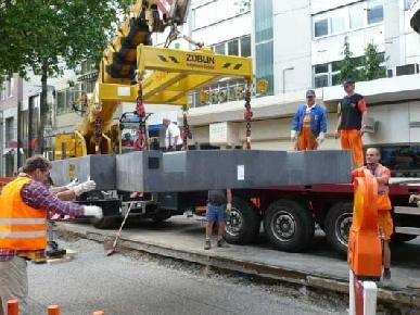W obliczu tych licznych aspektów, zakłady VBK znalazły optymalne rozwiązanie: prefabrykowane płyty torowiska o strukturalnej powierzchni z wbudowanym układem szyn. Na pierwszy rzut oka betonowe elementy przypominają wyglądem powierzchnię wyłożoną granitową kostką brukową. Dzięki nim czas budowy jest krótki, a na Kaiserstrasse posłużą one jako nawierzchnia ulicy aż do ukończenia tunelu. Następnie, płyty o szerokości ok. 3 m, długości 4 m i grubości 40 cm zostaną zdemontowane i ponownie ułożone w innej części miasta, np. na przebiegającej poprzecznie Karlstrasse. Na taki pomysł wpadli pracownicy zakładów VBK. Razem ze specjalistami z firmy NOE-Schaltechnik opracowali oni formę szalunkową, która umożliwia produkcję płyt torowiska o wyglądzie granitowej kostki. Uwe Konrath - kierownik działu budowlanego zakładów VBK - mówi: "Dla nas jest ważna produkcja w takich formach płyt betonowych, które będą dostosowane do istniejącej nawierzchni ulicy. W tym celu przesłaliśmy do firmy NOE próbki naszej kostki granitowej i plan ułożenia. Zgodnie z naszym życzeniem firma wykonała maty z tworzywa sztucznego." Oprócz dużego asortymentu standardowych struktur, firma NOE-Schaltechnik umożliwia projek-tantowi wykonanie form według indywidualnych wymagań. Jednocześnie przedsiębiorstwo udziela klientowi wsparcia swoją fachową wiedzą i pomocnymi informacjami.