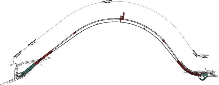 Na podstawie warunków topograficznych planiści komunikacyjni zdecydowali się na objazd miejscowości o długości 2,1 km. Budowa dzieliła się na trzy etapy główne: część zachodnią (315 m), część wschodnią (228 m) i tunel o długości 1687 m. Tunel został wzniesiony przy pomocy kombinacji metod budowy odkrywkowej i górniczej.