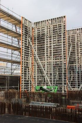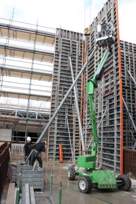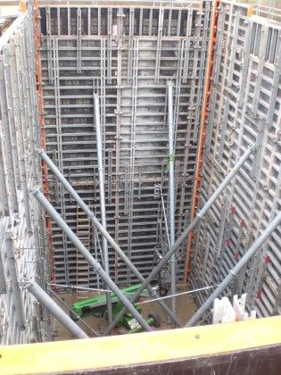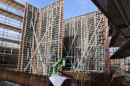 Budowa ścian wysokości 11,5 m i grubości 60 cm w jednym takcie. Odporne na parcie tarcze NOEtop i wypory BKS.