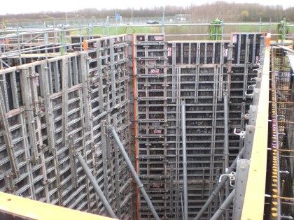 By szalunki NOEtop bezpiecznie pozostawały na swoim miejscu użyto zastrzałów BKS. Szybko się je stawia i powszechnie używa do stabilizowania betonowych elementów prefabrykatów oraz ściennych i słupowych deskowań. Ponieważ zastrzały doskonale sprawdzają się pod dużym obciążeniem, okazały się idealne na holenderskiej budowie znosząc dodatkowe naprężenia spowodowane wiatrem. Zastrzały BKS użyte podczas budowy zbiornika na ścieki miały 9,80 m długości