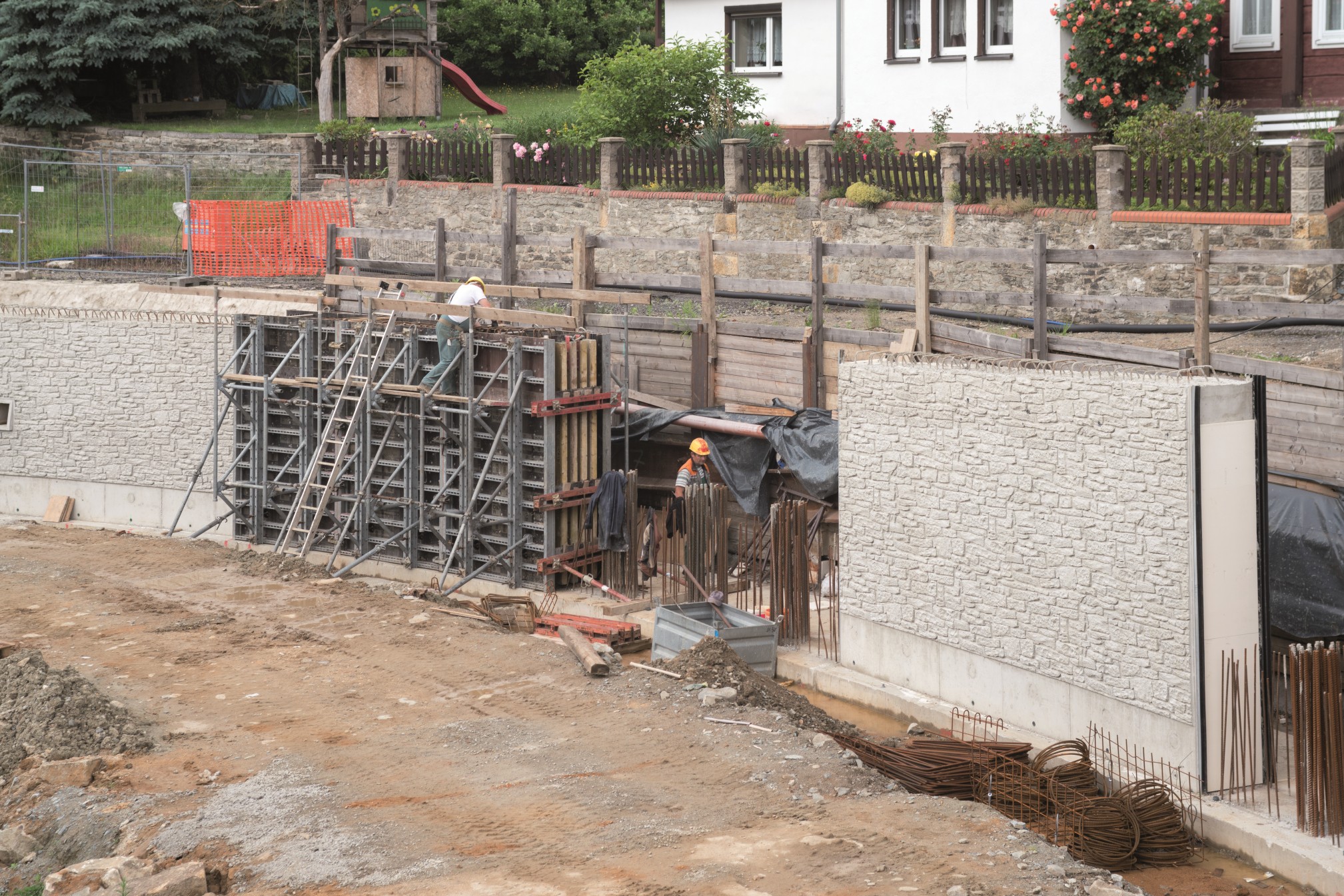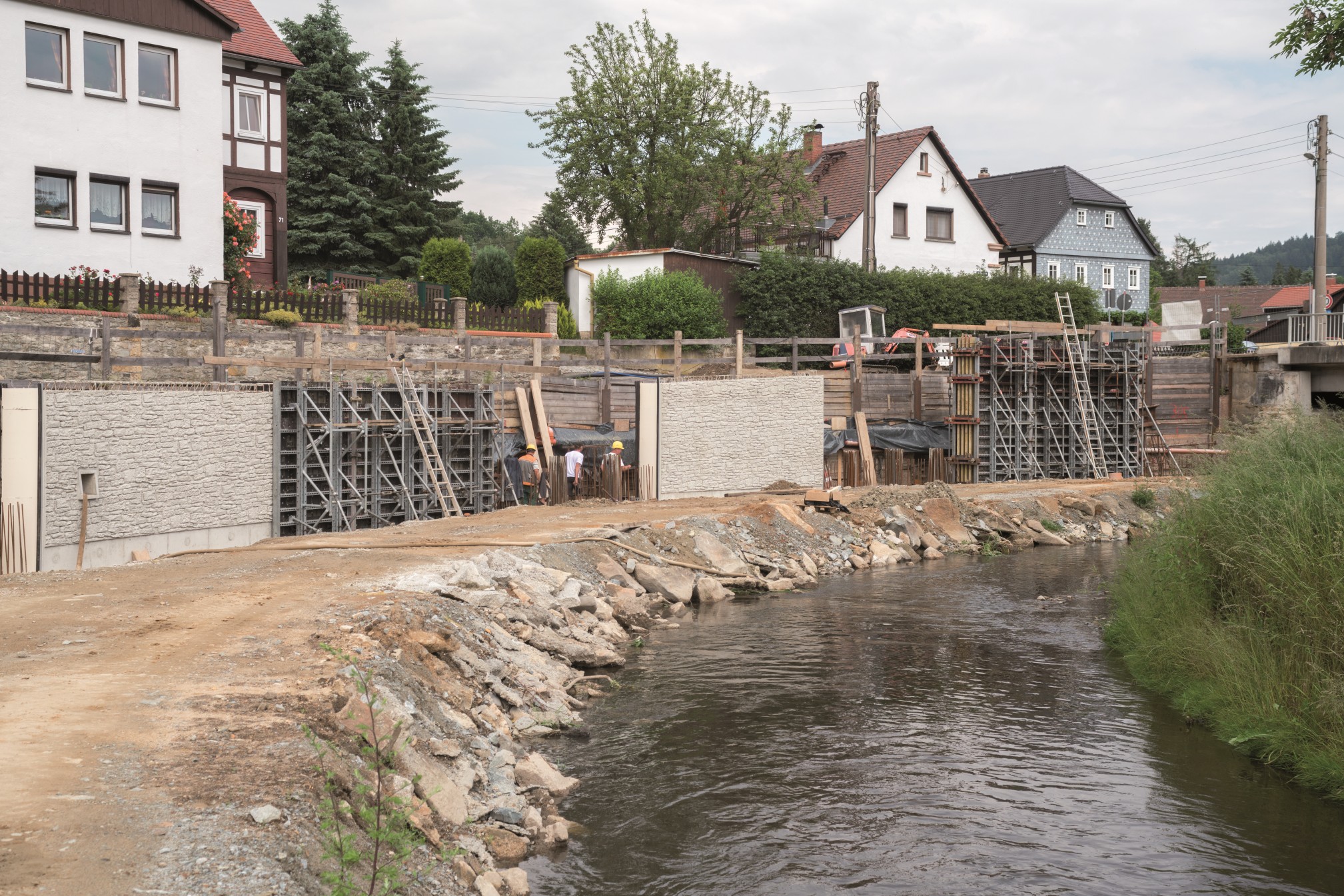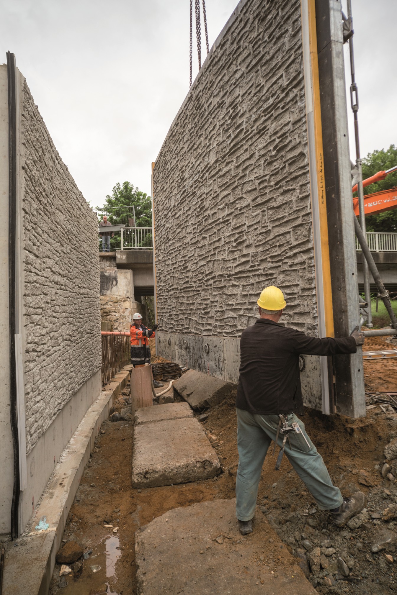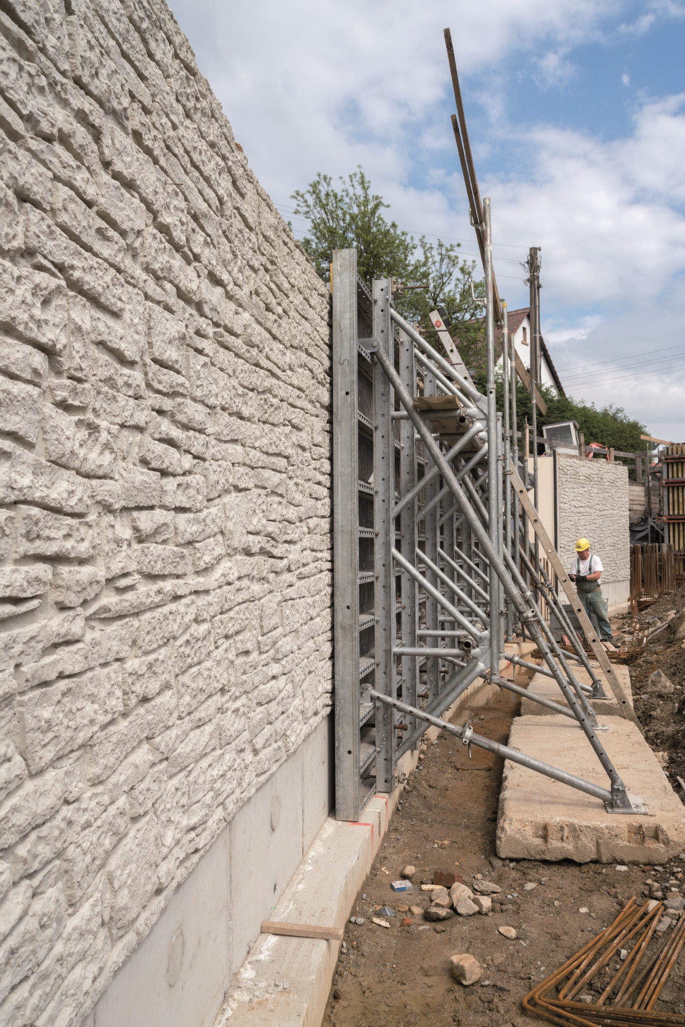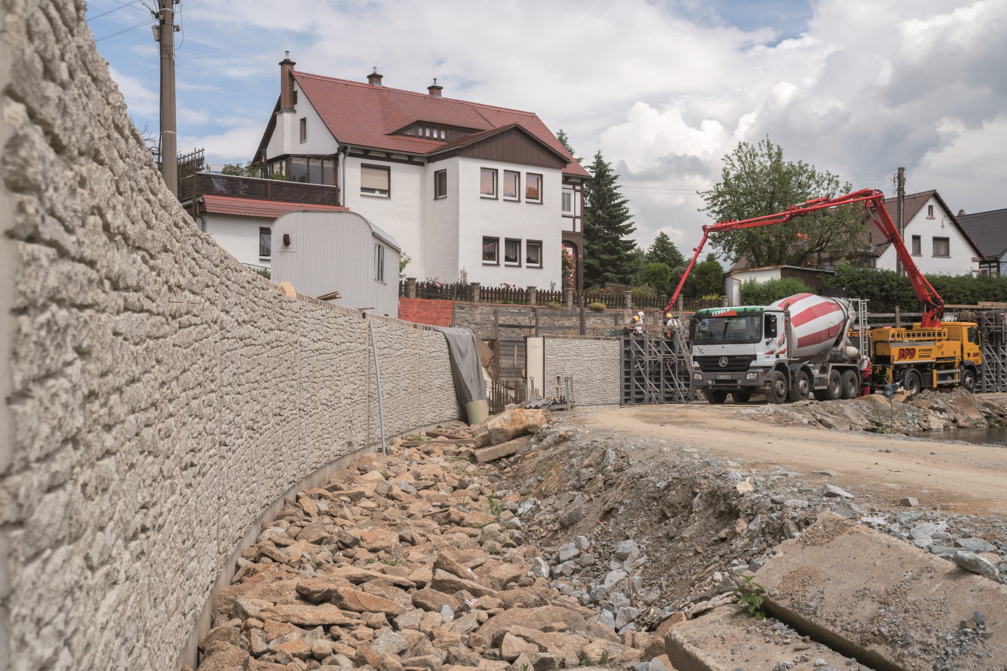 Großschönau to rejon leżący na terenie powiatu Görlitz w Saksonii i był wielokrotnie nawiedzany przez powodzie. Ostatnia miała miejsce w 2013 roku kiedy to mała rzeczka o nazwie Mandau wylała z brzegów. Wielka fala powodziowa zniszczyła nie tylko piwnice i ogrody, ale także ważną ścianę oporową. Ścianę tę wzniesiono w 1901 roku a wspierała ona drogę publiczną. Kiedy powódź przeszła posprzątano bałagan i gruzy i okazało się, że ściana oporowa bardzo ucierpiała podczas kataklizmu. Część ściany z pewnością można było naprawić, jednakże inne jej fragmenty były tak poważnie uszkodzone, że trzeba było je wymienić. Nowe części miały powstać ze wzmocnionego betonu (klasa C 30/37; klasy eksponowania XC4, XD1, XF2, XA2) a władze zażyczyły sobie, żeby wyglądały jak istniejący już kamienny mur.