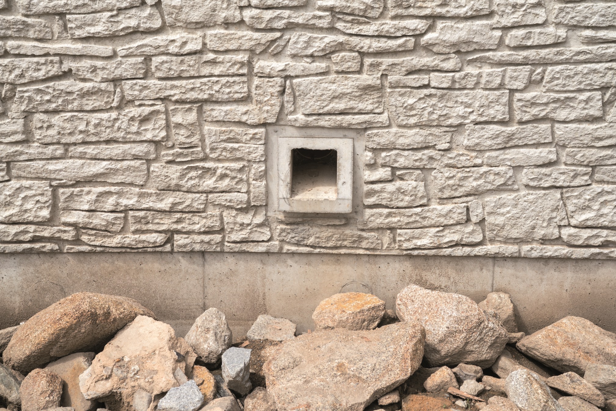 Oznaczało to, że nowe fragmenty ściany oporowej o grubości 0,65 cm powinny posiadać powierzchnię przypominającą mur z naturalnego kamienia o nieregularnej powierzchni. By osiągnąć ten efekt generalny wykonawca zamówił teksturowane matryce produkowane przez NOE-Schaltechnik. Producent sprzedaje je pod nazwą NOEplast i posiada ogromny wybór podstawowych wzorów. Teksturowane matryce NOEplast mogą nadać betonowej powierzchni teksturę np. drewnianych desek, groszkowanego betonu czy nawet gipsu. Do ściany oporowej w Großschönau wybrano motyw Murus Romanus. Ta teksturowana matryca ma około 4,1 cm grubości i sprzedaje się ją w standardowych rozmiarach do 6,00 x 2,50 m. Można też ją wyprodukować w większych wymiarach. Matryce posiadają dopasowane nierówne brzegi pozwalające na połączenie ich bez widocznych spoiw.
