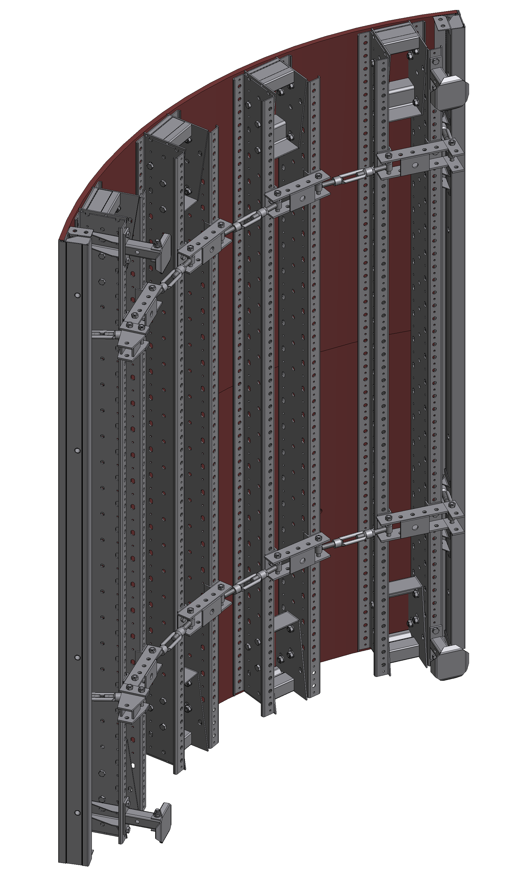 Imponujący system deskowania okrągłego do krzywoliniowych, pionowych elementów o promieniach od 2750 mm. Początkowy promień (dla pierwszego użycia) jest ustawiany w fabryce, dzięki czemu deskowanie może zostać dostarczone na budowę w stanie gotowym do natychmiastowego zastosowania. Ustawienie innych promieni przy kolejnych użyciach można wykonać szybko i łatwo bezpośrednio na placu budowy.