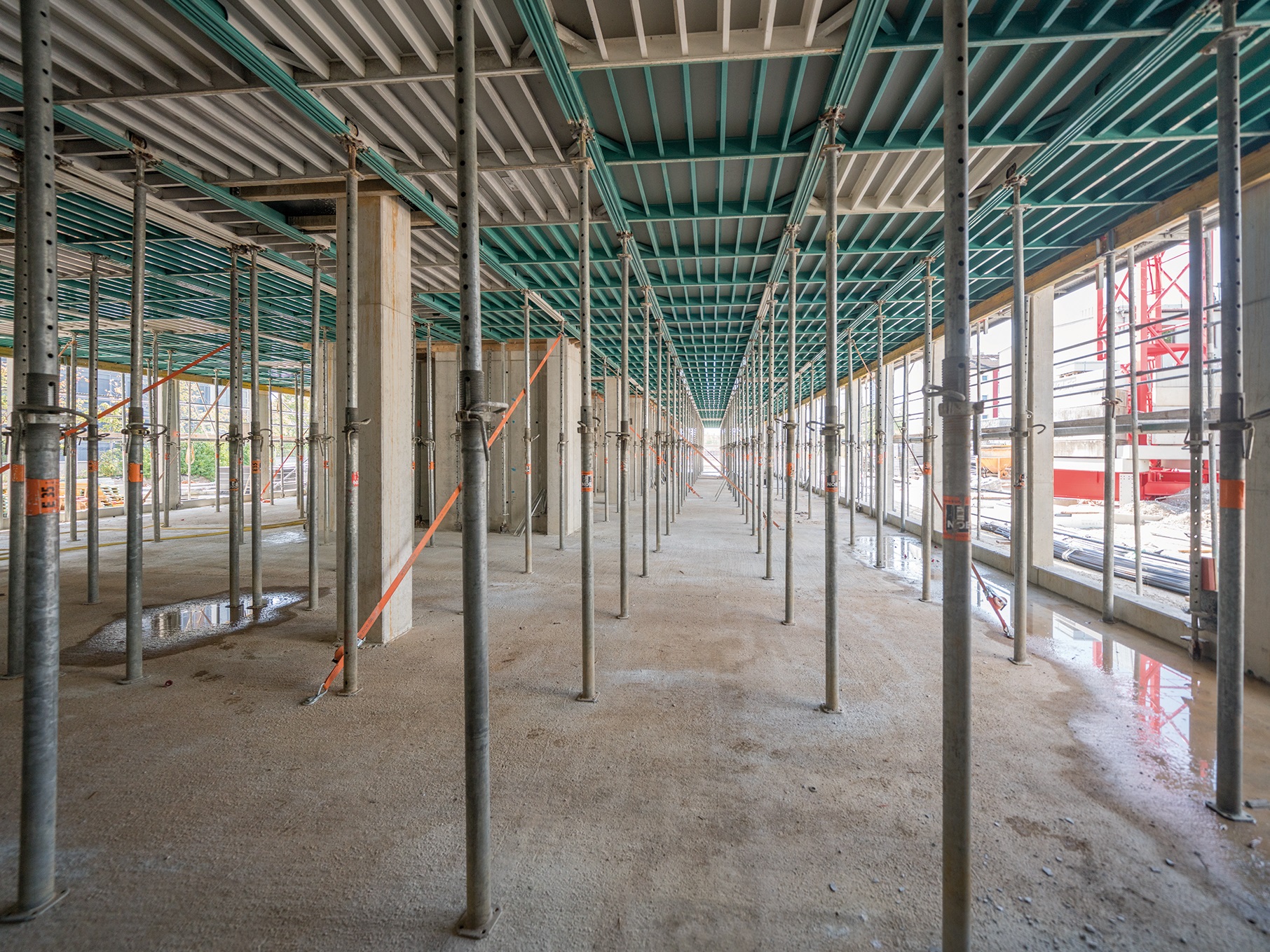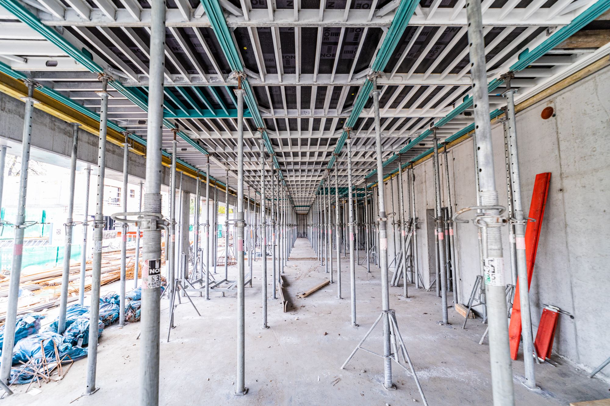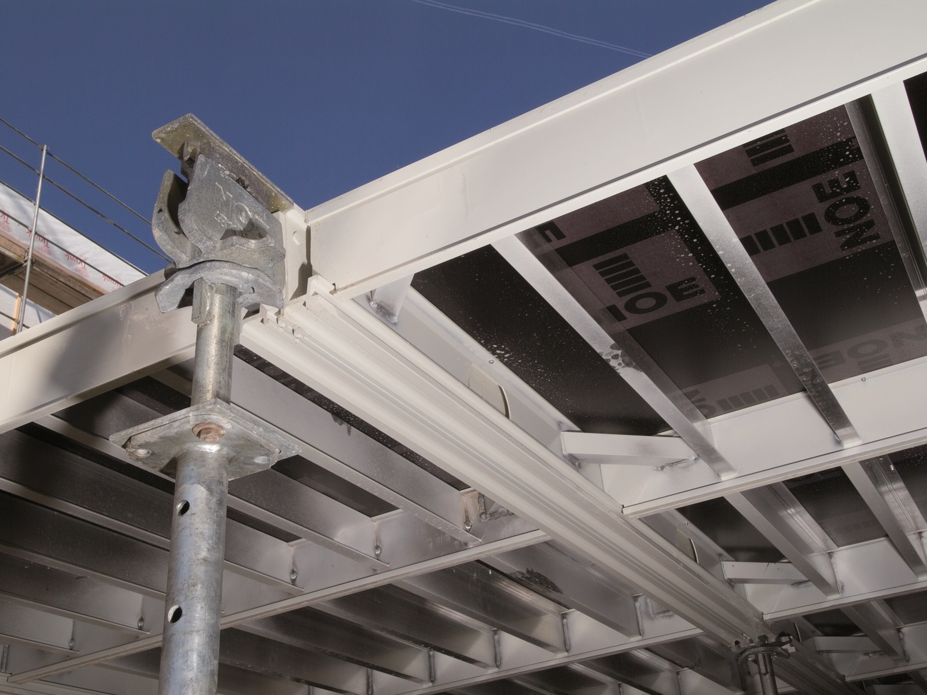 Lekkie i proste w użyciu deskowanie stropu NOEdeck. Głowice opadowe o wysokiej wytrzymałości pozwalają na wysokie tempo prac żelbetowych.
